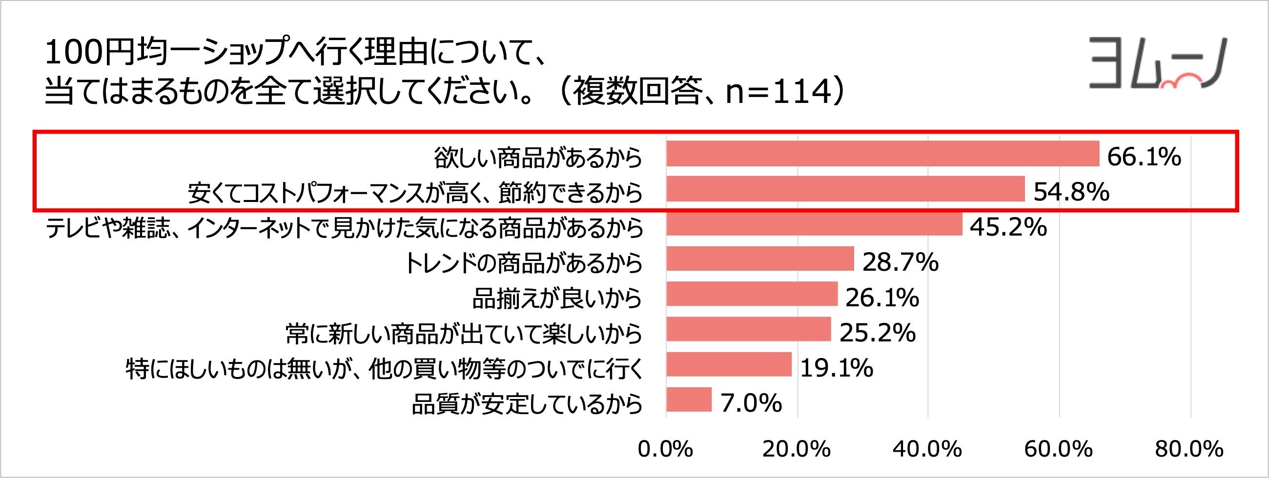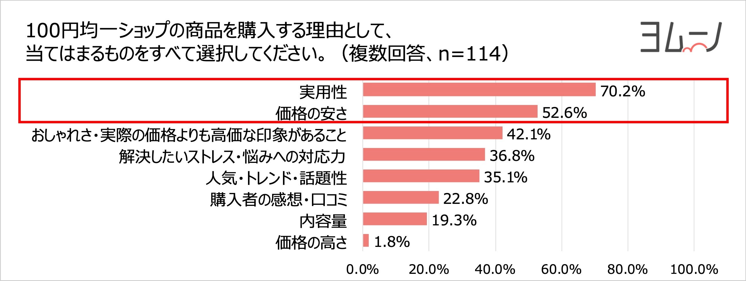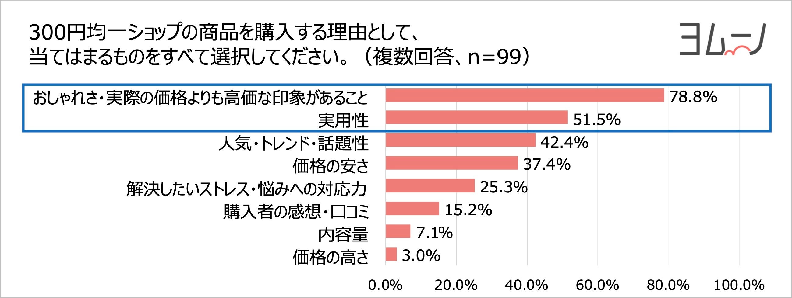 一方、300均は「おしゃれさ・実際の価格よりも高価な印象があること」との回答が78.8%で最多となり、「実用性」を大きく上回りました。100均と300均では、利用目的に違いがあることがうかがえます。
