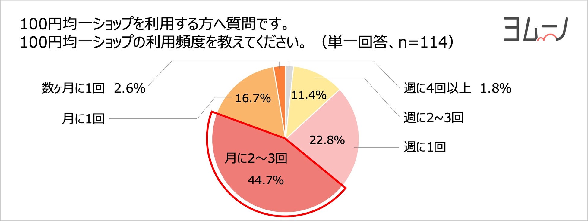均一ショップの利用頻度についてたずねたところ、100均は「月に2〜3回」との回答が44.7%、300均は「数ヶ月に1回」との回答が33.3%で最多となりました。