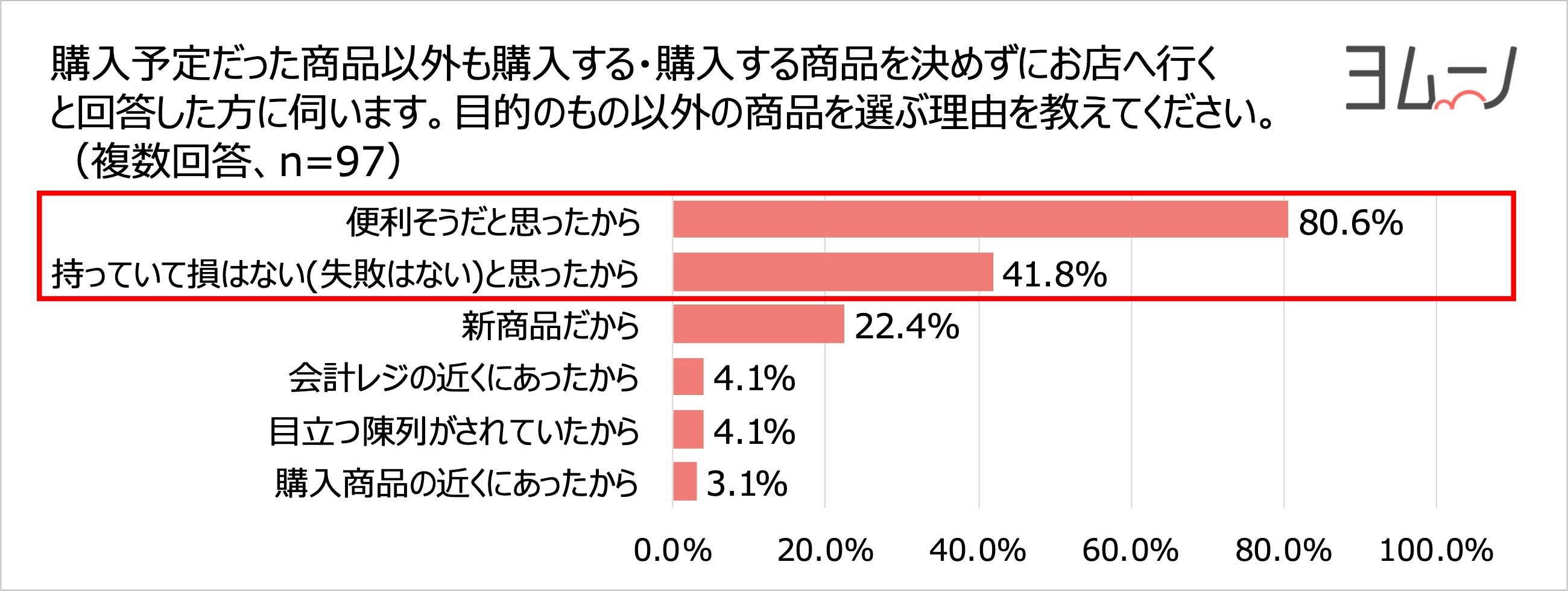100均での買い物傾向についてたずねたところ、「購入予定だった商品以外も追加で少し購入することが多い」との回答が65.8%で最多となりました。予定外の商品も購入する方に理由をたずねたところ、「便利そうだと思ったから」との回答が80.6%で最多となり、次いで「持っていて損はない(失敗はない)と思ったから」との回答が41.8%となりました。購入予定だった商品以外にも、店内で魅力的な商品を見つけた場合はその商品も試してみたいと考え、購入を決める方が多いことがうかがえます。