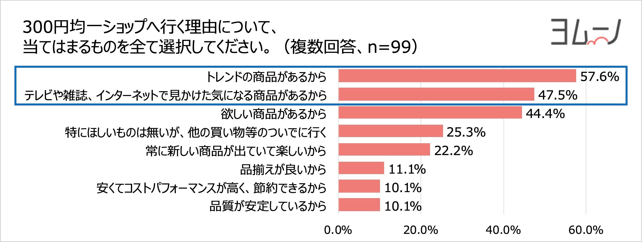 均一ショップを利用する理由についてたずねたところ、100均は「欲しい商品があるから」との回答が66.1%で最多となり、次いで「安くてコストパフォーマンスが高く、節約できるから」との回答が54.8%となりました。また、300均は「トレンドの商品があるから」との回答が57.6%、「テレビや雑誌、インターネットで見かけた気になる商品があるから」との回答が47.5%となりました。