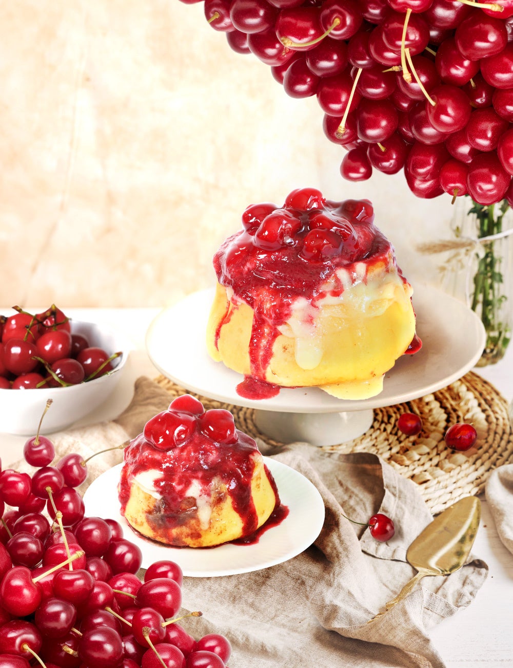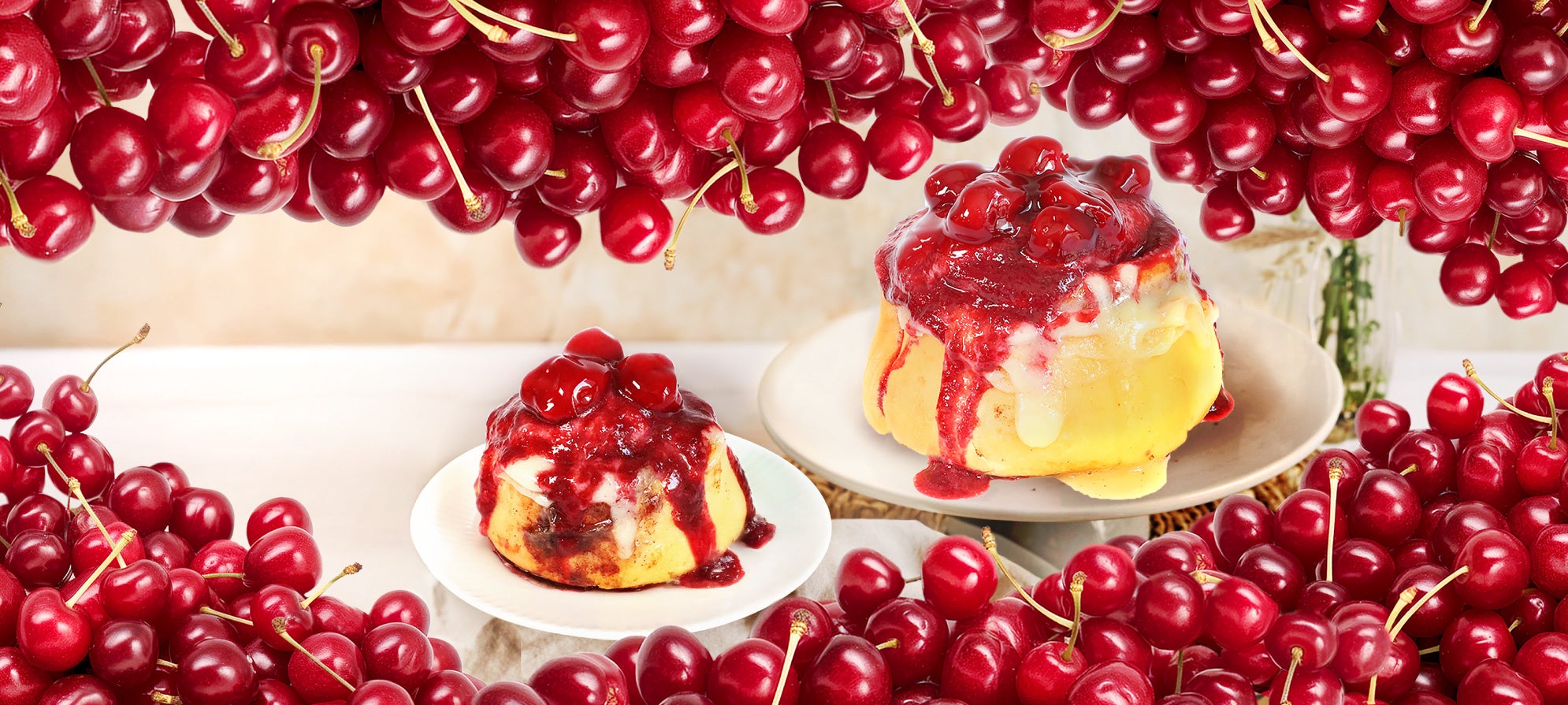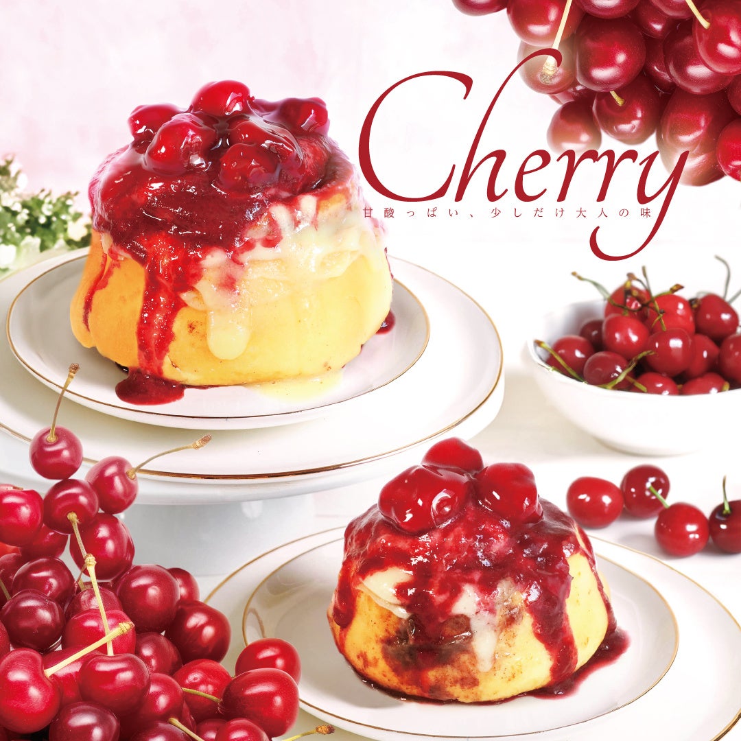 深紅に輝くレッドチェリーが、丁寧に焼き上げられたシナモンロールを華やかに彩ります。