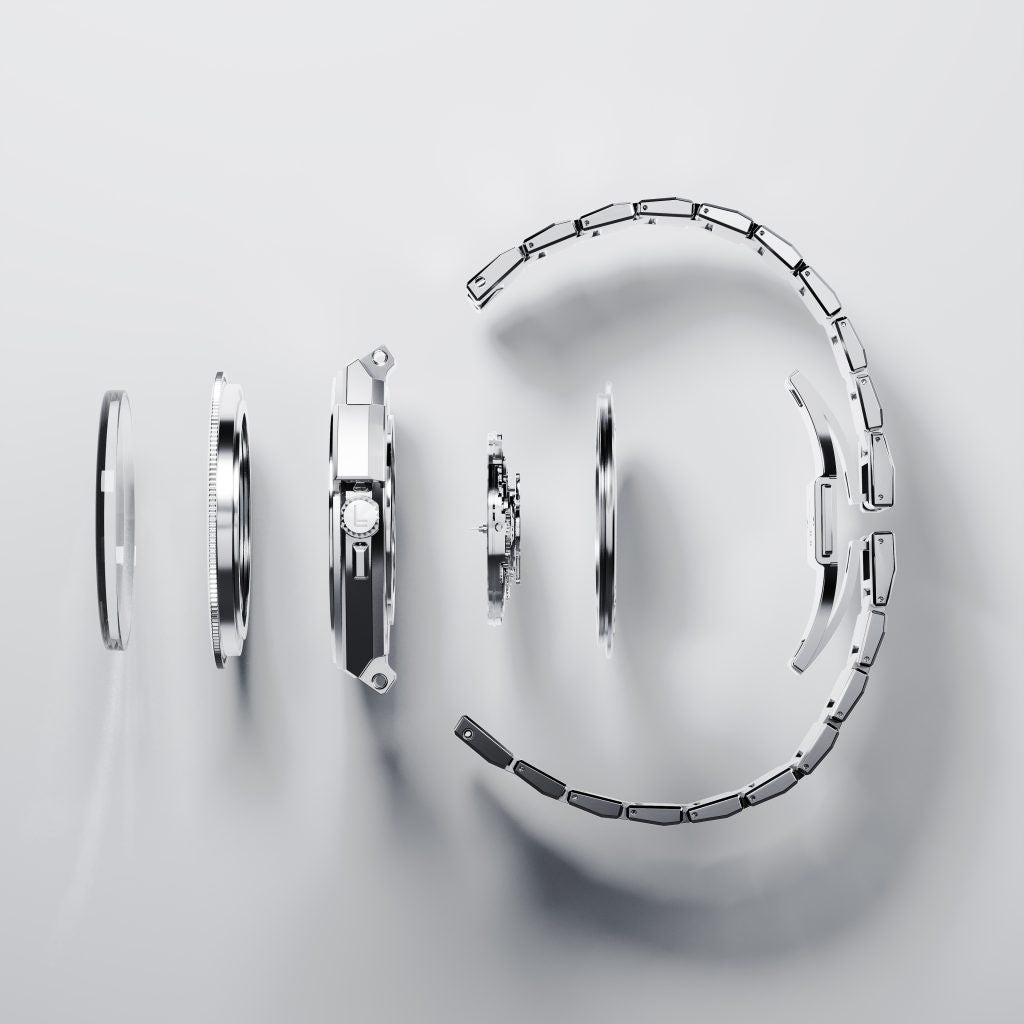 316L ステンレススティールケース/直径40.8mm、高さ9.8mm/特許取得済みリューズプロテクションSledge®/内側無反射コーティングサファイアガラス/バタフライダブルフォールディングクラスプ/マルチリンクステンレススチールブレスレット/DIN8310準拠の10気圧防水/※DIN:ドイツ工業規格