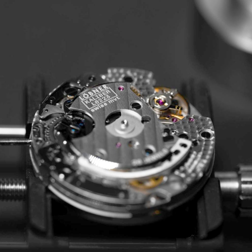 キャリバー LÖBNER6223(La Joux-Perret L112ベース)/スイス製コラムホイール式自動巻きクロノグラフ/分散型時刻表示用LÖBNER モジュール/LÖBNER ロゴ入りタングステンローター/60時間パワーリザーブ/振動数28,800VPH(4Hz)/26石/DIN/ISO1413準拠の耐衝撃性