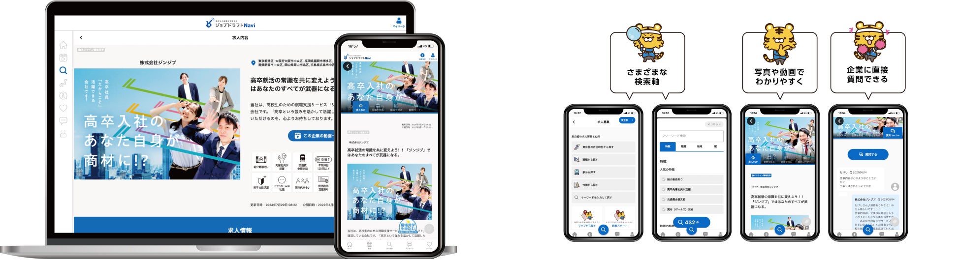 高卒採用に文字情報のみを用いていた企業の「求人票」の情報を、Webサイトやアプリに掲載した高校生のための求人情報メディアです。高校生は学校の進路指導室以外でも、スマホなどからいつでも情報にアクセスできます。