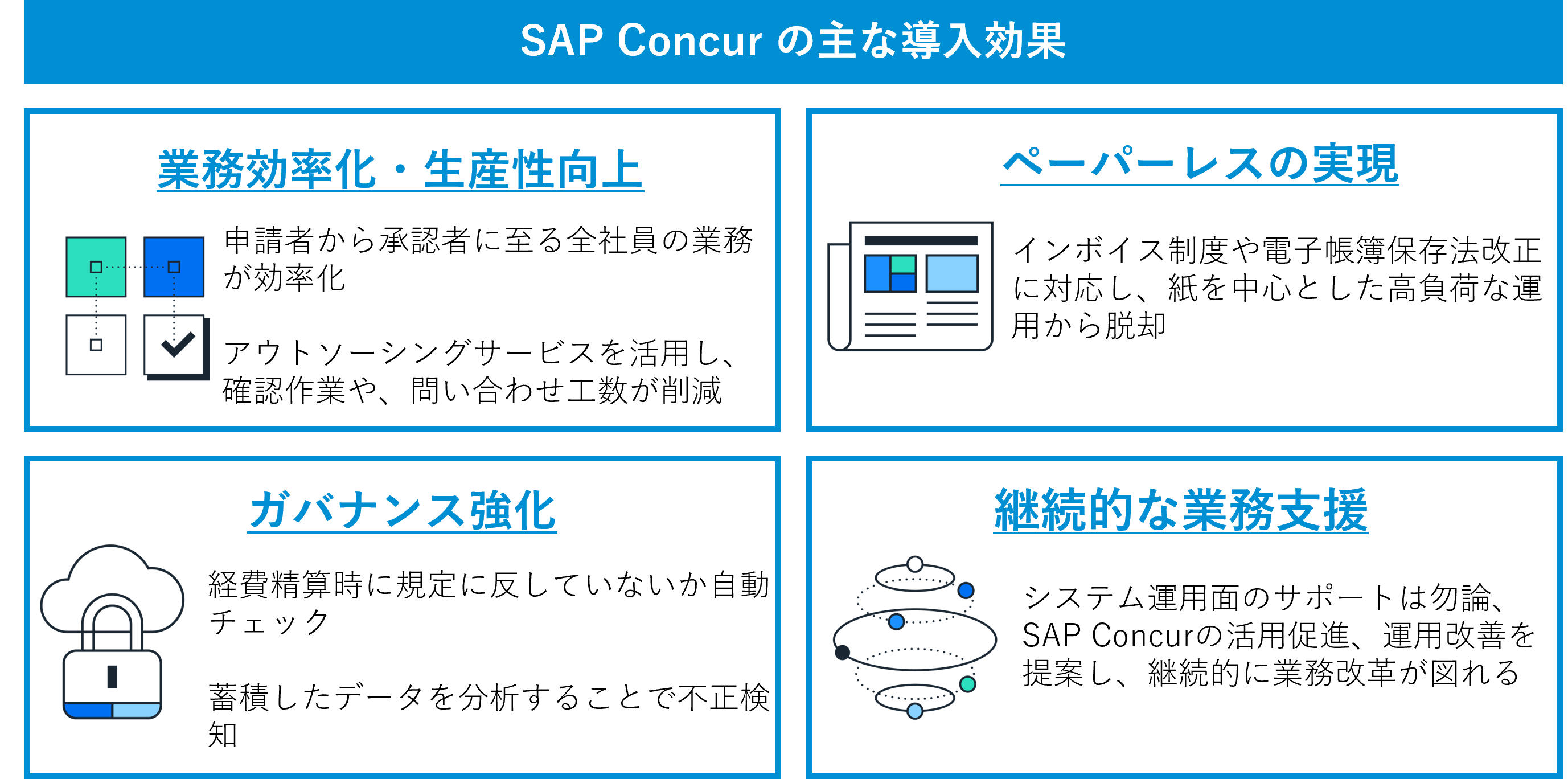SAP Concurの利用によって、申請から承認まで、経費精算に関わる作業を全てデジタル上で完結できるようになり、ペーパーレス対応も可能となります。また、経費に関するデータを蓄積し、分析することで、コスト抑制にも寄与します。