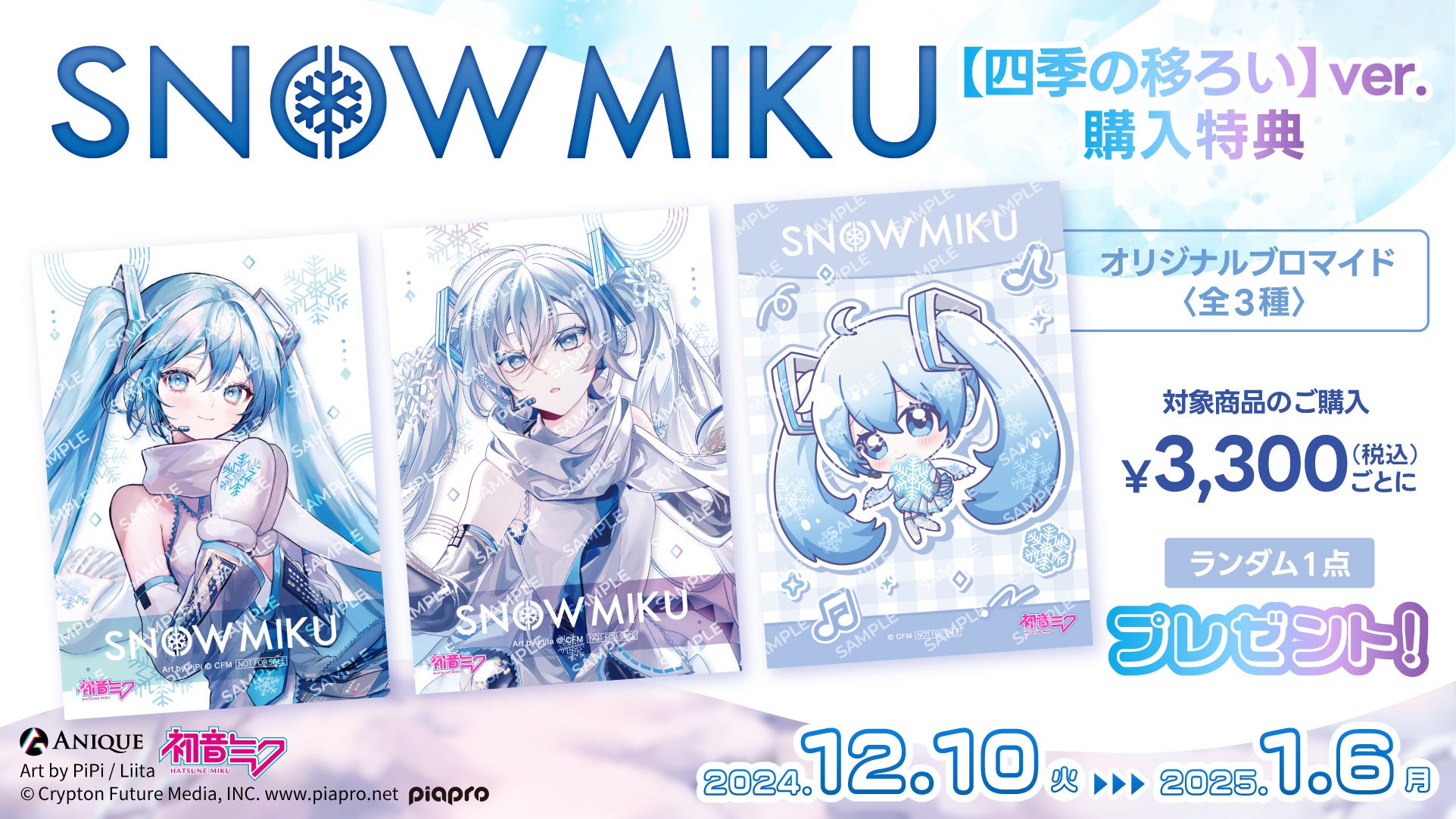販売期間中(2024/12/10~2025/1/6)、『雪ミク』対象商品を3,300円(税込)お買い上げごとに【購入特典】雪ミク オリジナルブロマイド(全3種)をランダムで1点プレゼントいたします。