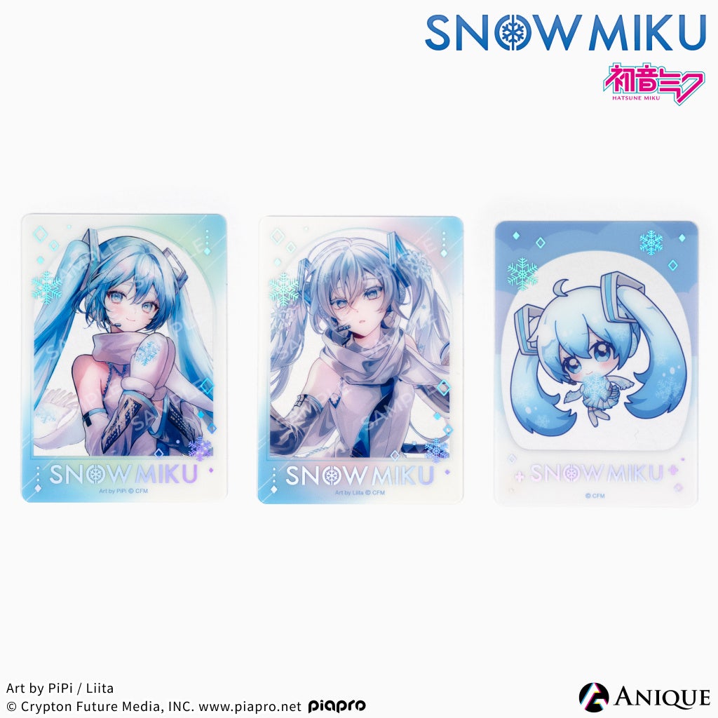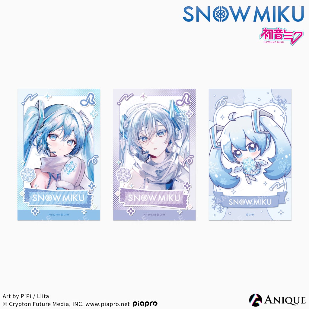 雪ミクの新規イラスト3種を使用した、箔押し加工がきらめくクリアフォトカードです。