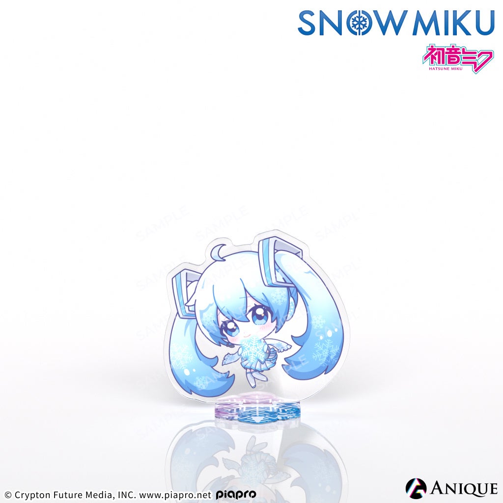 雪ミクの新規描き起こしミニキャライラストを使用した、手のひらサイズのアクリルスタンドです。