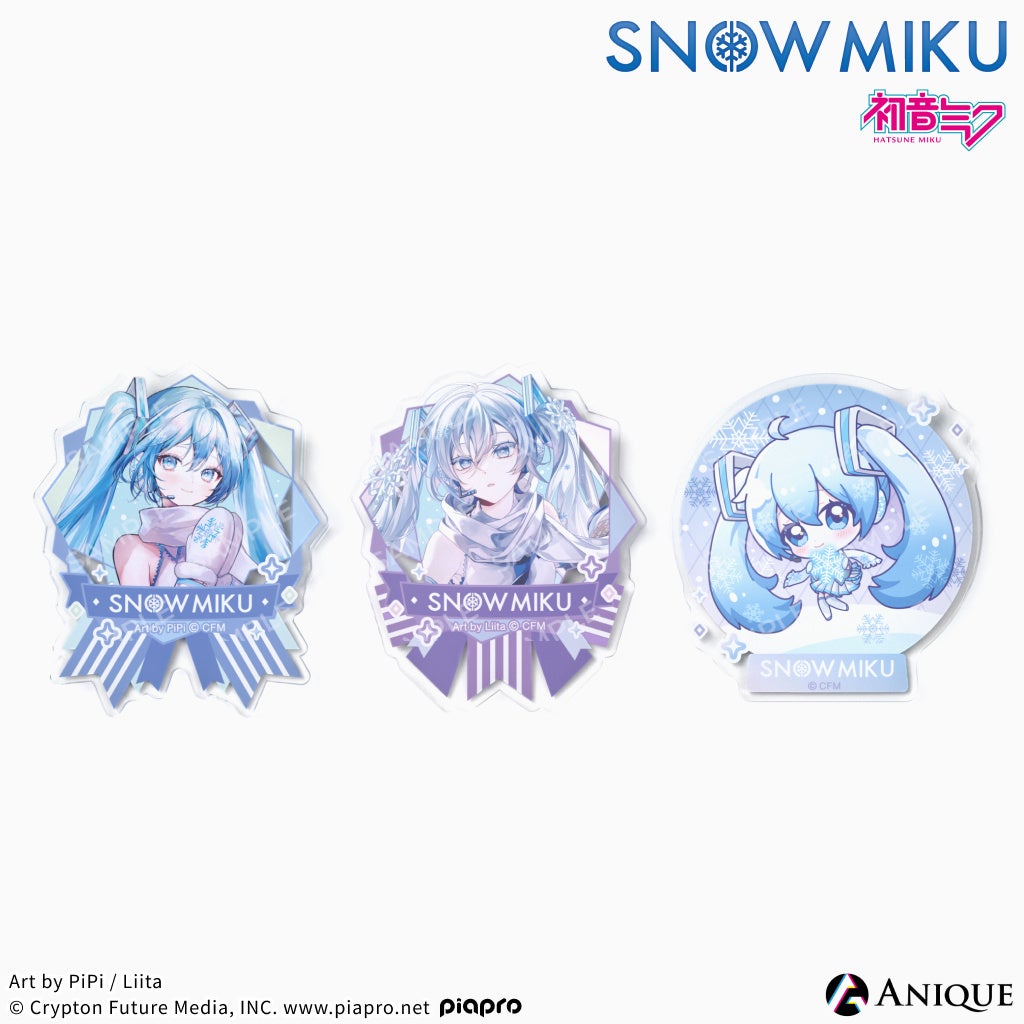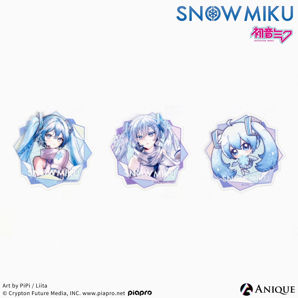 雪ミクの新規イラスト3種を使用した、透明感のあるアクリルバッジです。
