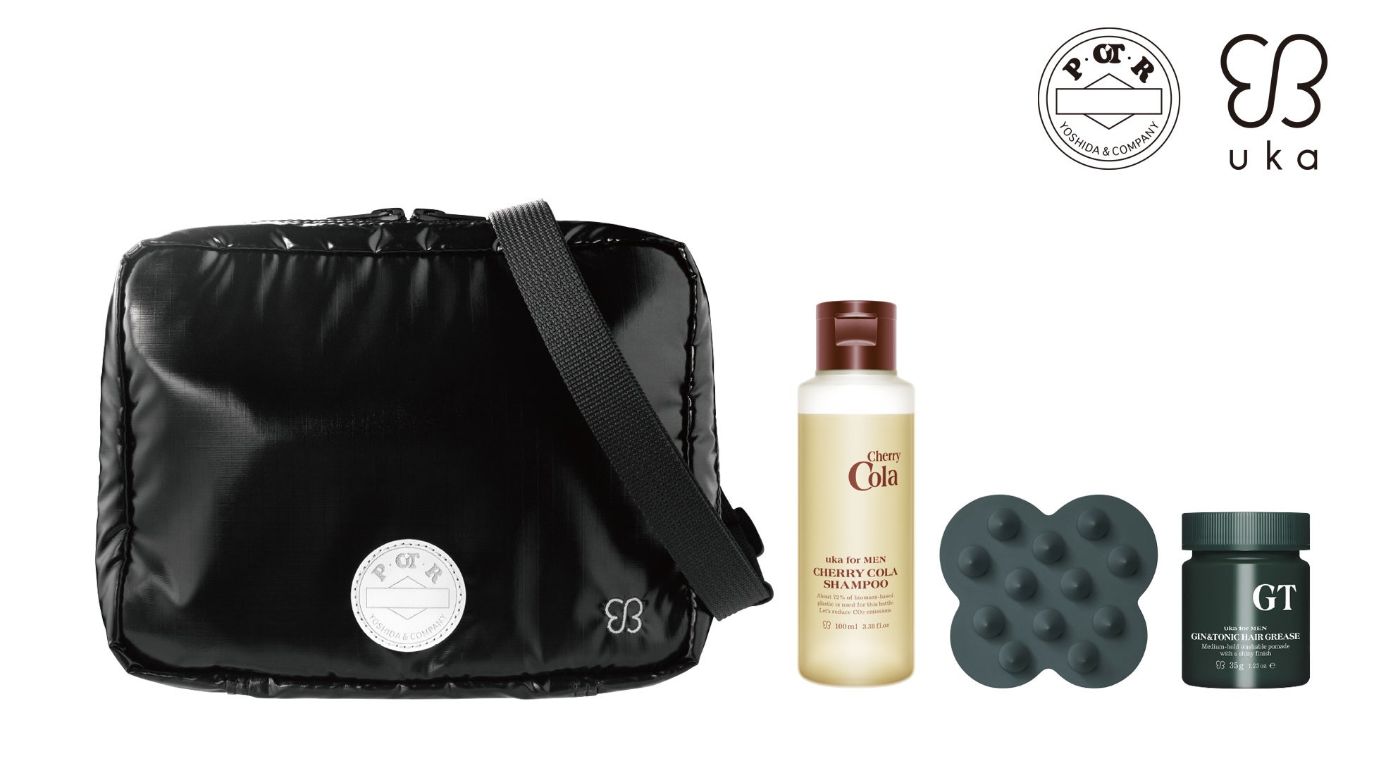 ukaで販売するポーチには新作のuka for MEN Shampoo Cherry Colaをセット。レモン、シナモン、バニラの天然香料で表現したチェリーコーラの香りに、メントールで爽快感をプラスしました。吉田カバンで販売するポーチには爽やかでセンシュアルな香りのuka for MEN E SHAMPOOをセット。それぞれのポーチには異なる種類のスタイリング剤とケンザンも付属しています。