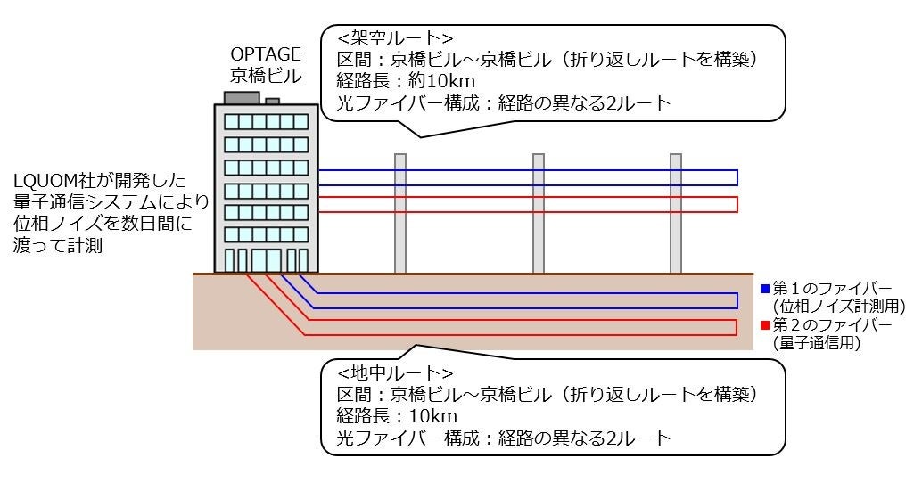 本実験では、商用光ファイバーにおける環境要因を定量的に解析するために、オプテージ本社から地中・架空ルート(往復10km)を構築し、LQUOM社が開発した量子通信システムを組合せることで、実用環境における位相ノイズの計測と補償を行いました。本実験では、2本の並列ファイバーを用意して空間分割多重方式の位相補償を検証しています。この方式では、1本のファイバーを位相ノイズ計測に用い、もう1本のファイバーを量子通信に用います。そして、第1のファイバーで計測した位相ノイズを第2のファイバーから差し引くことで、第2のファイバー(量子通信用)の位相を安定化します。