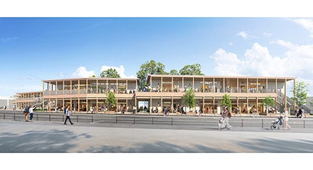 また、住友林業が設計・施工する本施設は、純木造の2階建て低層商業施設であり、深い軒下空間と連続する木の柱など、古民家を継承した伝統的建築要素を取り入れています。内外装に木材を多く使用し、外部の構造柱も現しとして露出させることで、自然の温かみと木の風合いを感じられ、古民家と調和した親しみやすい街並みを形成します。さらに、資材調達から解体時までのCO2排出量である「エンボディドカーボン」および炭素固定量を「OneClickLCA」※1で算定し、環境配慮型の木造建築を実現します。