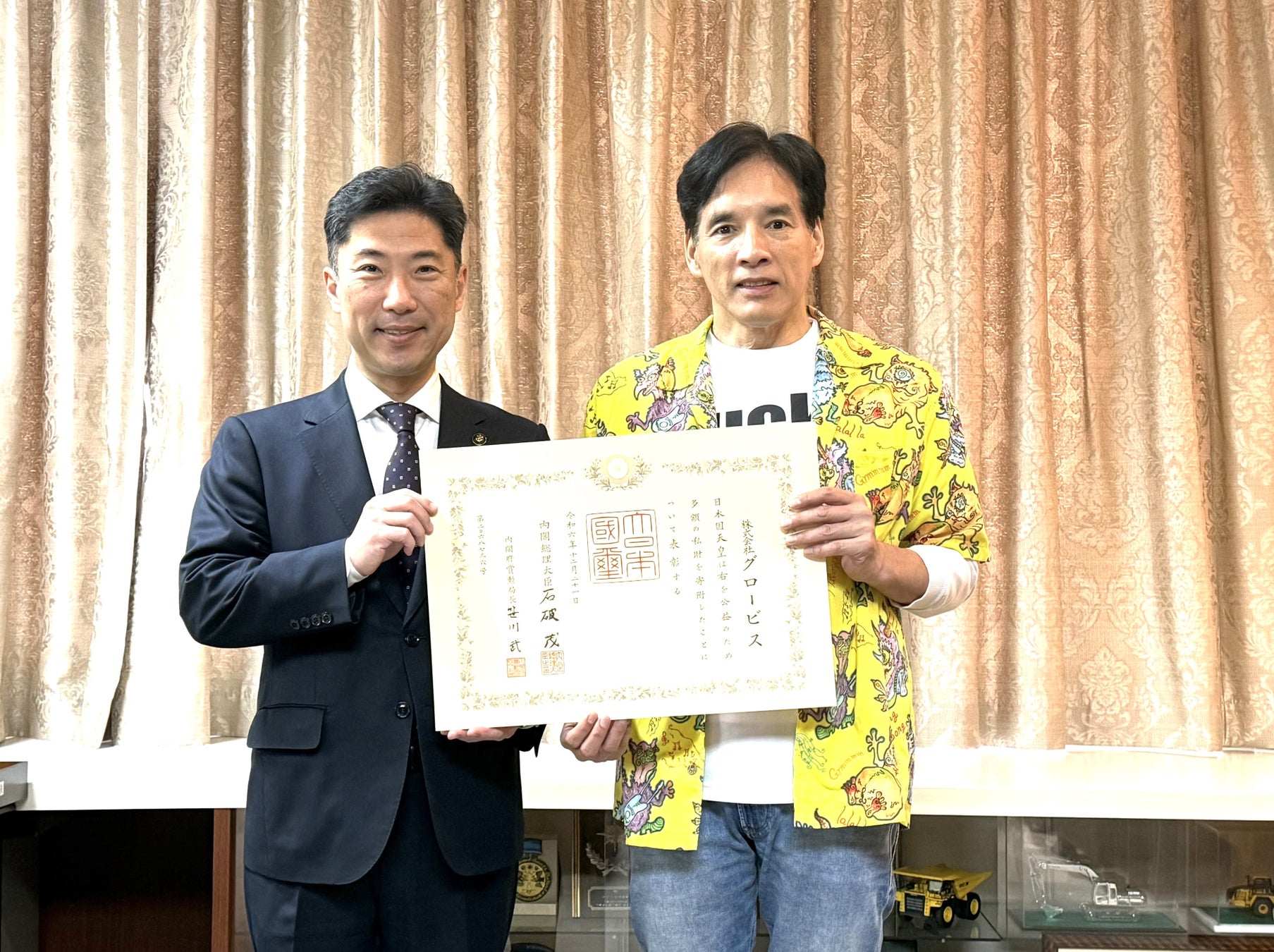 「ひたちなか市役所にて執り行われた紺綬褒章の伝達式において、大谷市長より天皇陛下のお言葉を賜りましたことは、誠に身に余る光栄であり、心より感謝申し上げます。グロービスは社会貢献活動の一環として『水戸ど真ん中再生プロジェクト』をはじめ、水戸・茨城の地方創生を推進してまいりました。今後も、ひたちなか市をはじめ、茨城県、そして日本の発展のために、より一層尽力いたします」