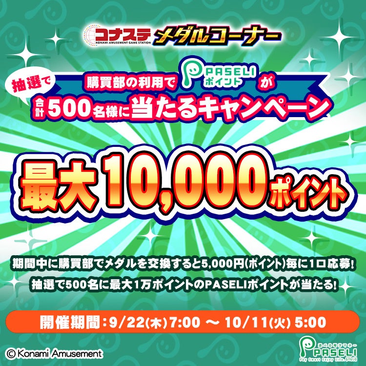 株式会社コナミアミューズメントは、9月22日より、ご自身のPCやスマートフォンでメダルゲームが楽しめる「コナステ メダルコーナー」の専用メダルを「購買部」で交換すると、KONAMIが運営する"遊べる電子マネー"『PASELI(パセリ)』※1の「PASELI(パセリ)ポイント」が当たるキャンペーンを開催することをお知らせします。