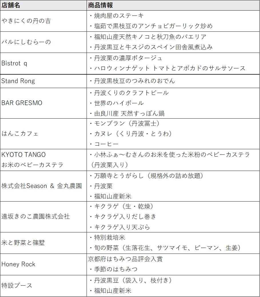 今回は、福知山自慢の秋食材である丹波栗や丹波の黒豆などを味わえる飲食ブース、カフェブースに加え、農作物を販売する生産者ブースが出店し、「丹波の秋の味覚」を堪能できます。