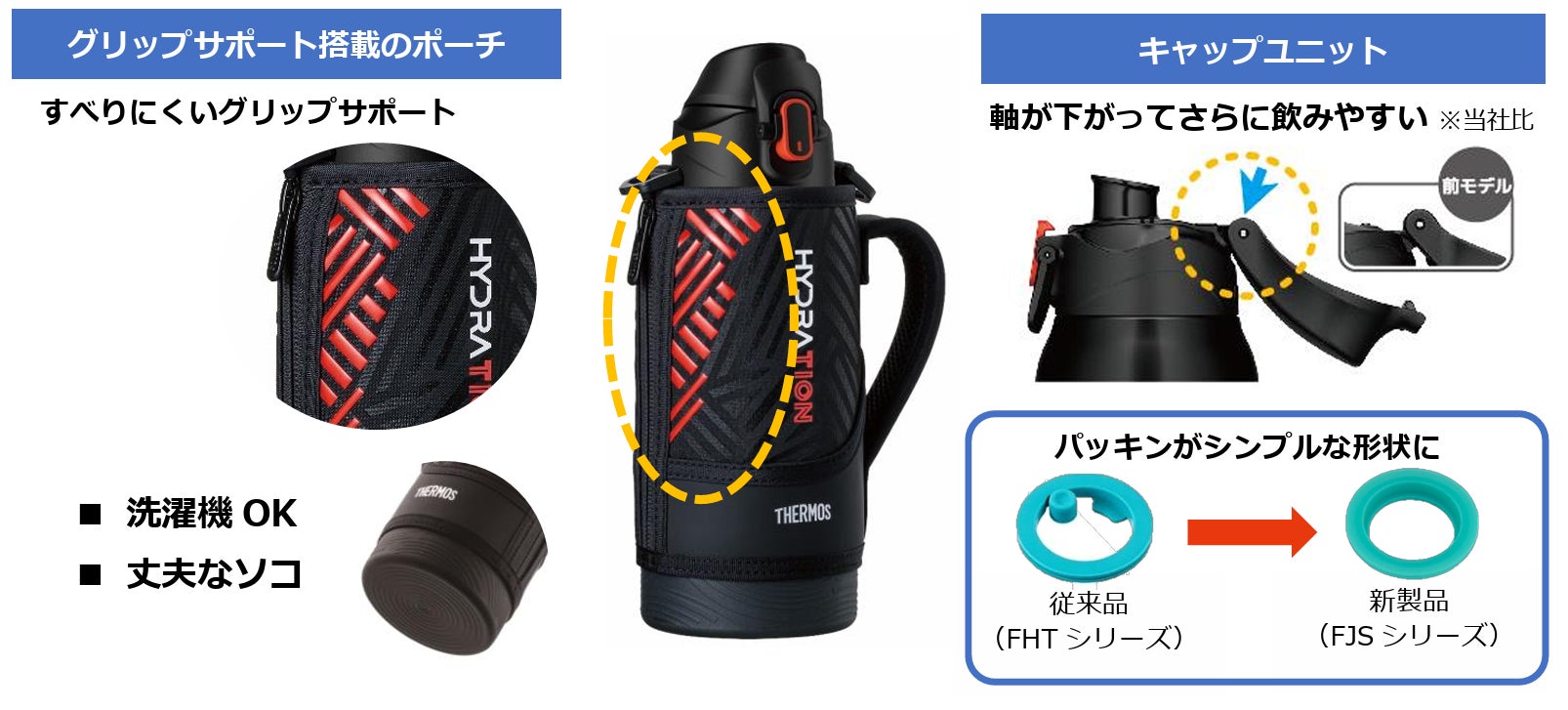 このたび、付属の専用ハンディポーチに新機能を搭載。すべりにくいシリコーン素材のプリント加工を施した「グリップサポート」により、両手でポーチを握ってもすべりにくくなりました。キャップユニットのロックリングは開閉しやすい形状にこだわり、大きく開くフタは軸が下がってさらに飲みやすくなりました。また、パッキンはシンプルな形状でお手入れしやすくなり、ハンディポーチは洗濯機で洗う事ができます。