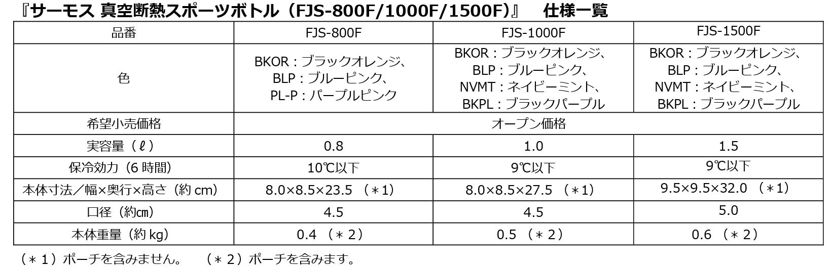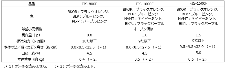 『サーモス 真空断熱スポーツボトル(FJS-800F/1000F/1500F)』 仕様一覧