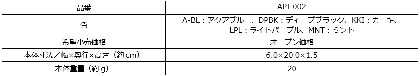 左から A-BL:アクアブルー、DPBK:ディープブラック、KKI:カーキ、LPL:ライトパープル、MNT:ミント