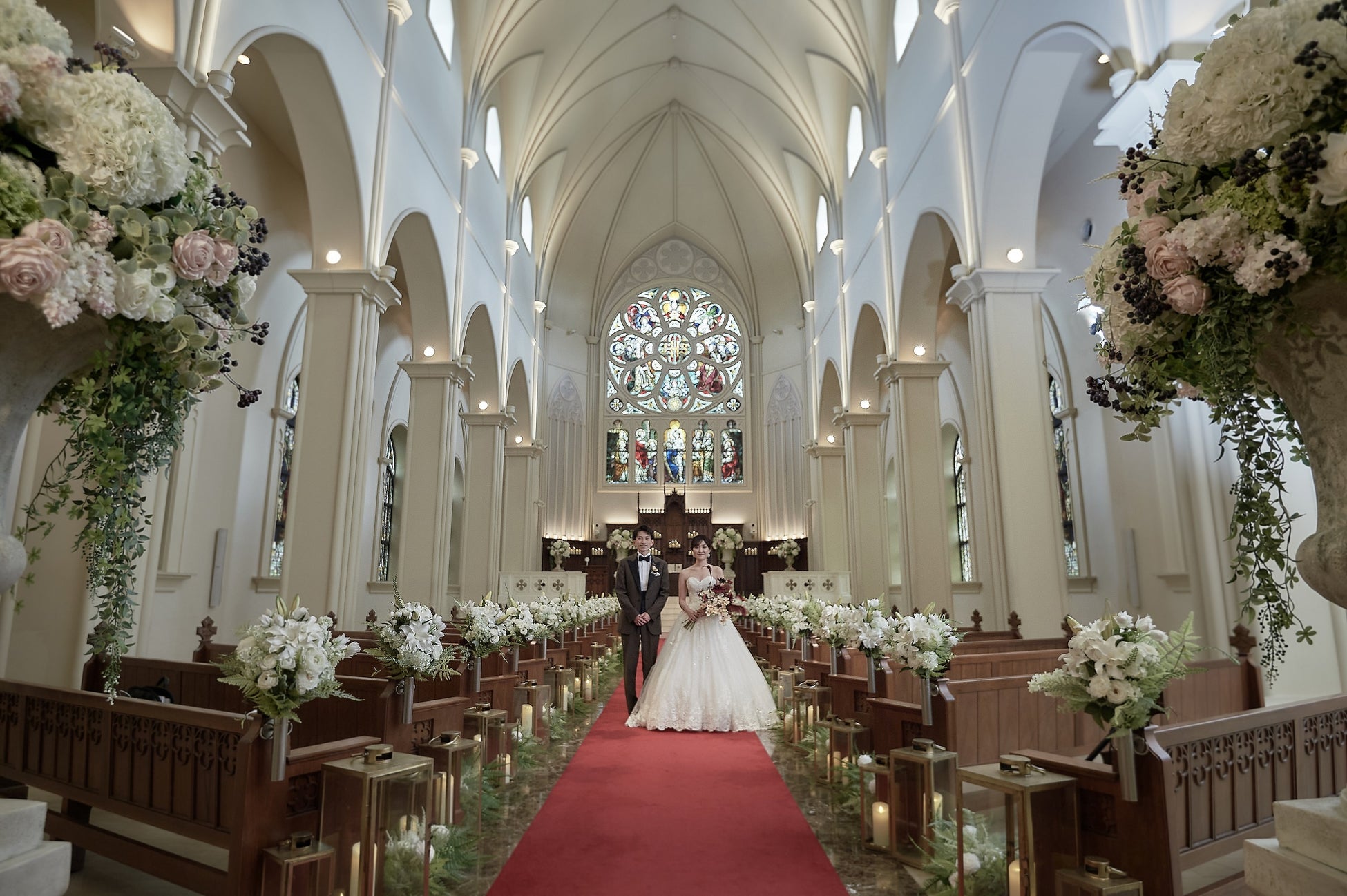独立型の本格大聖堂は、高さ53mという首都圏最大級の規模を誇るスケールがポイント。繊細なゴシック建築様式のこだわりぬいた荘厳な空間は、ドラマや映画のロケ地としても利用される美しさ。そんなチャペルの魅力と共に写真に閉じ込めて。