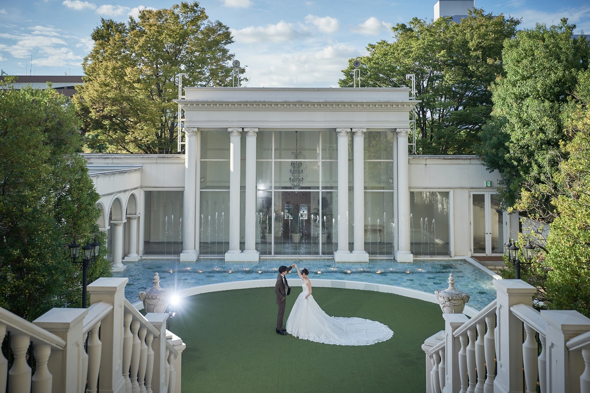 庭園の中央に佇むのは、水と石と自然豊かな緑あふれるチャペル。祭壇を囲むのはクリスタルを思わせる滝の輝きと、ドレス姿を美しく引き立てる緑の森。神聖でありながらナチュラルな息吹に満ちたアットホームなセレモニーフォトが叶います。
