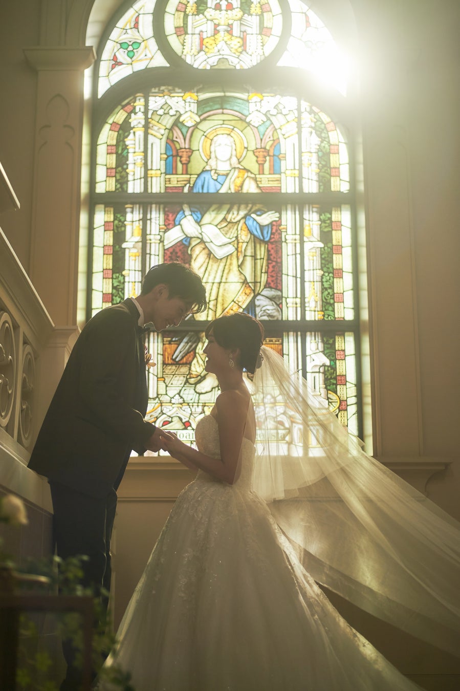 洗練されたブランドドレスを身に纏い荘厳なステンドグラスの大聖堂で神聖な空気を感じながらの撮影は