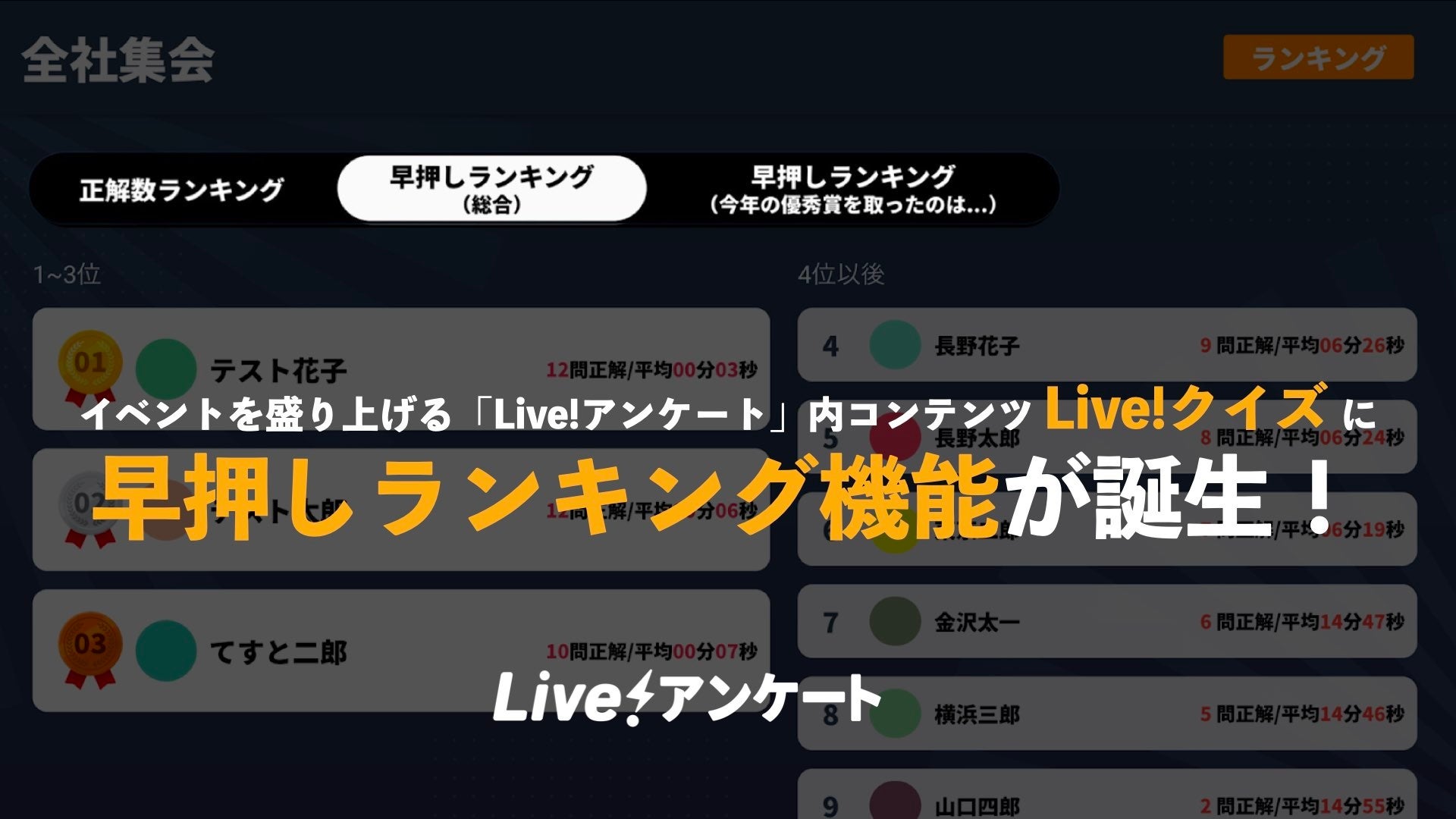 イベントを盛り上げるリアルタイムアンケート「Live!アンケート」が、クイズを楽しむ「Live!クイズ」に新機能「早押しランキング機能」を追加しました!
