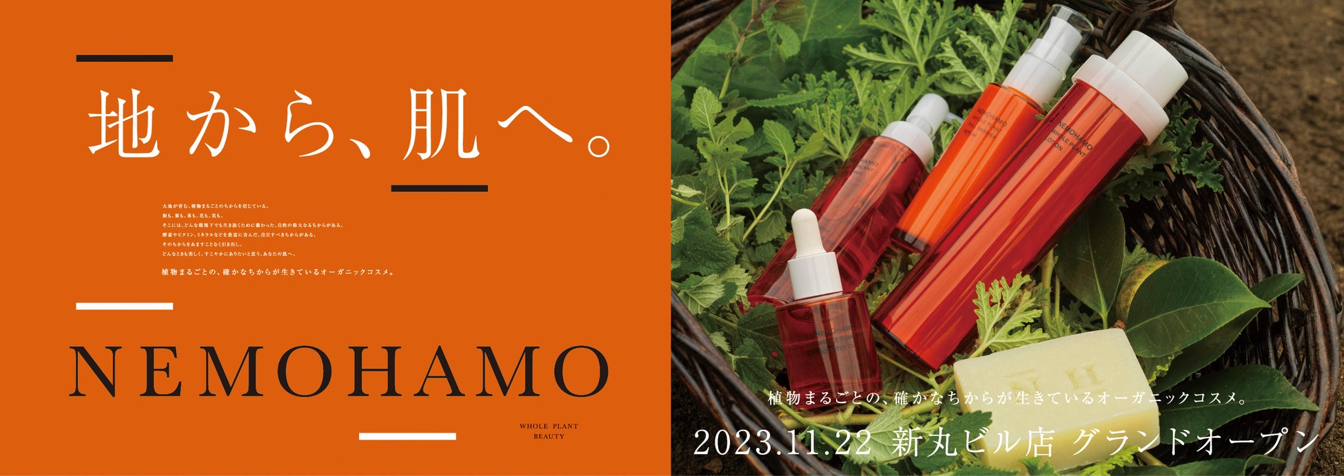 「NEMOHAMO 」は、その名の通り、植物の根も、葉も、茎も、花も、 実も、植物が生きるために持っている力を、そのままお肌へ活かすために、植物まるごとをエキス化・配合したオーガニックコスメブランドです。この度、関東初出店となる「 NEMOHAMO 新丸ビル店」が、 2023 年 11 月 22 日(水)にオープンいたします。高感度なショップが立ち並び、上質な賑わいを感じる丸の内エリアで、こだわりの商品をお届けします。