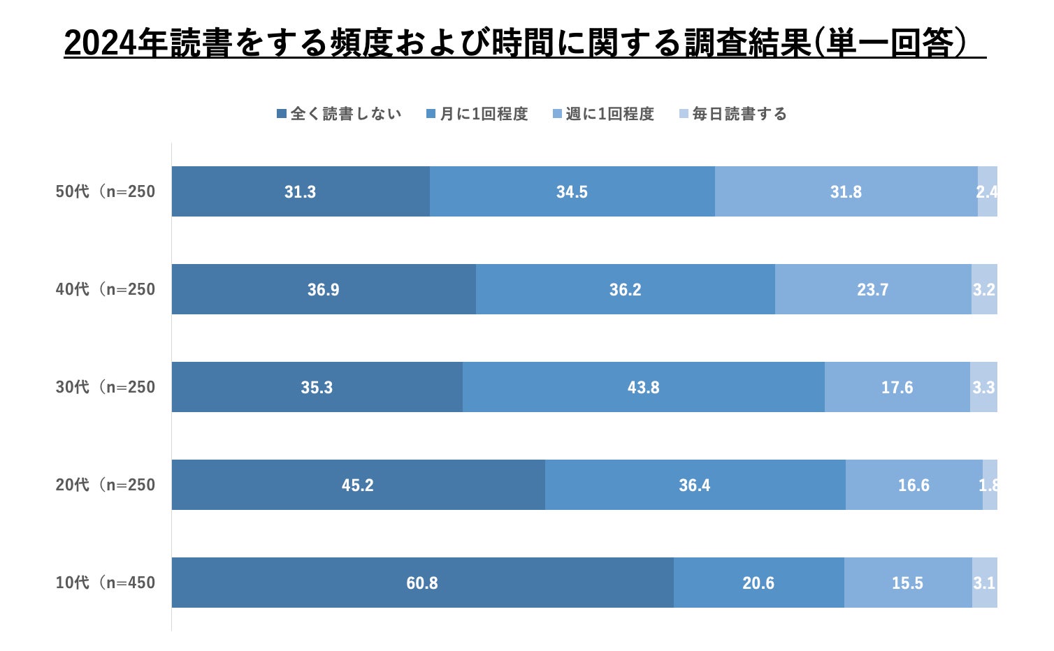 10代の6割が読書を全くしないという結果に。一方で50代の3人に2人は読書をする。