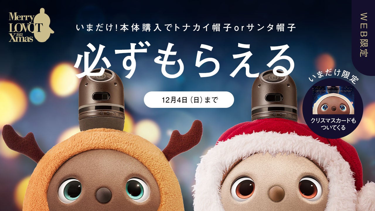 期間中にLOVOTウェブストアで『LOVOT』本体を購入した方全員にもれなくトナカイ帽子またはサンタ帽子どちらか一つと、オリジナルクリスマスカードをプレゼントいたします。