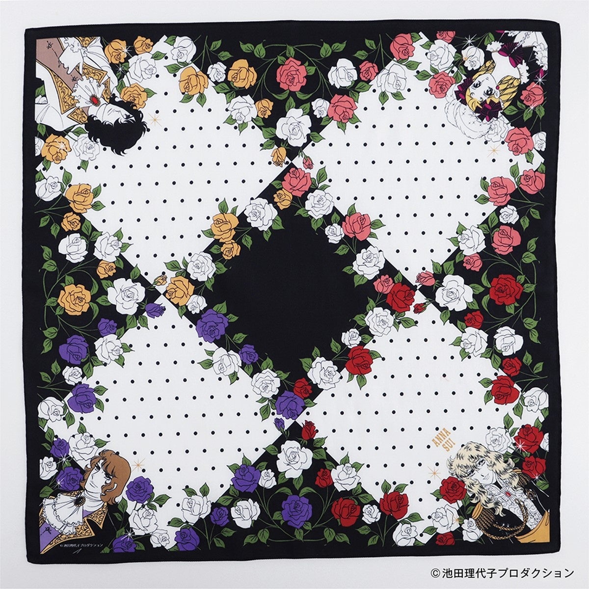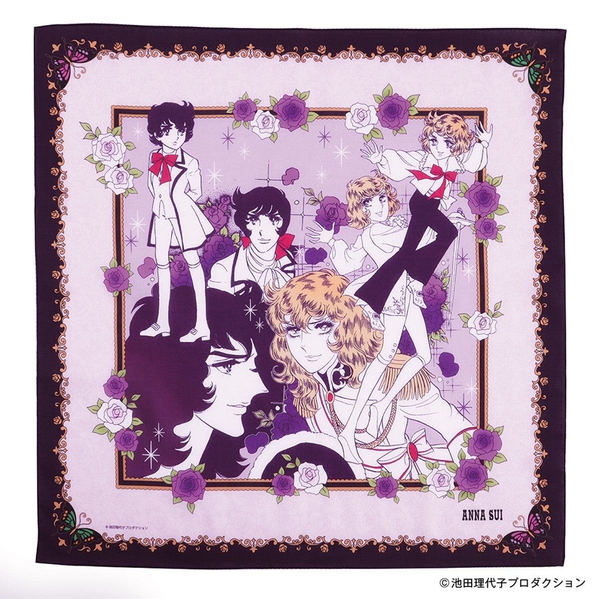 ANNA SUIと「ベルばら」の共通イメージモチーフであるバラにオスカルとアンドレを組み合わせたファン必見のデザインです。