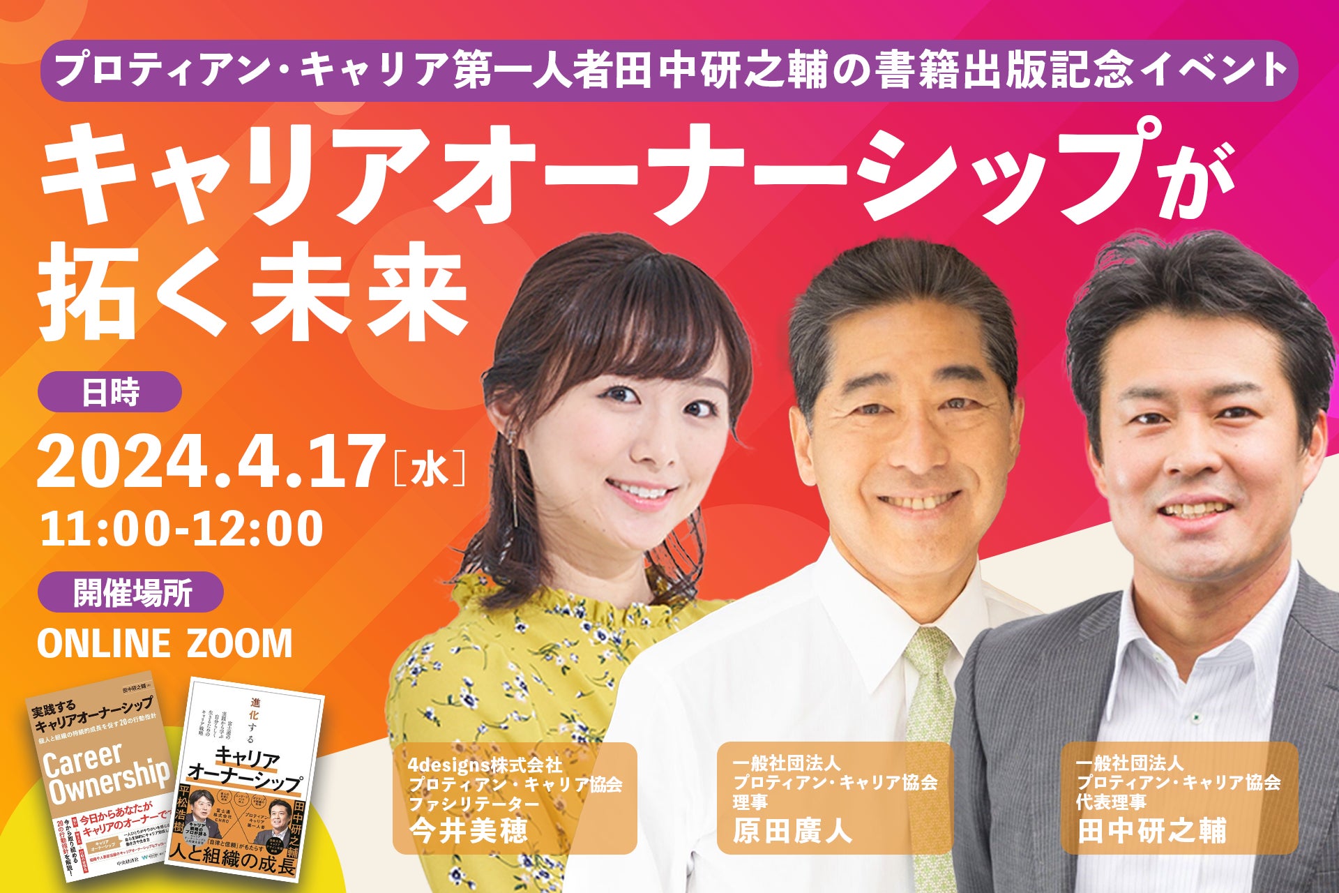 一般社団法人プロティアン・キャリア協会(東京都新宿区、代表理事:田中研之輔・有山徹、以下「当協会」)は、組織と個人のより良い関係構築と個人の主体的なキャリア開発を支援する団体です。この度、2024年4月17日(水)11:00~「~プロティアン・キャリア第一人者 田中研之輔の書籍出版記念イベント~キャリアオーナーシップが拓く未来」をオンラインにて開催します。