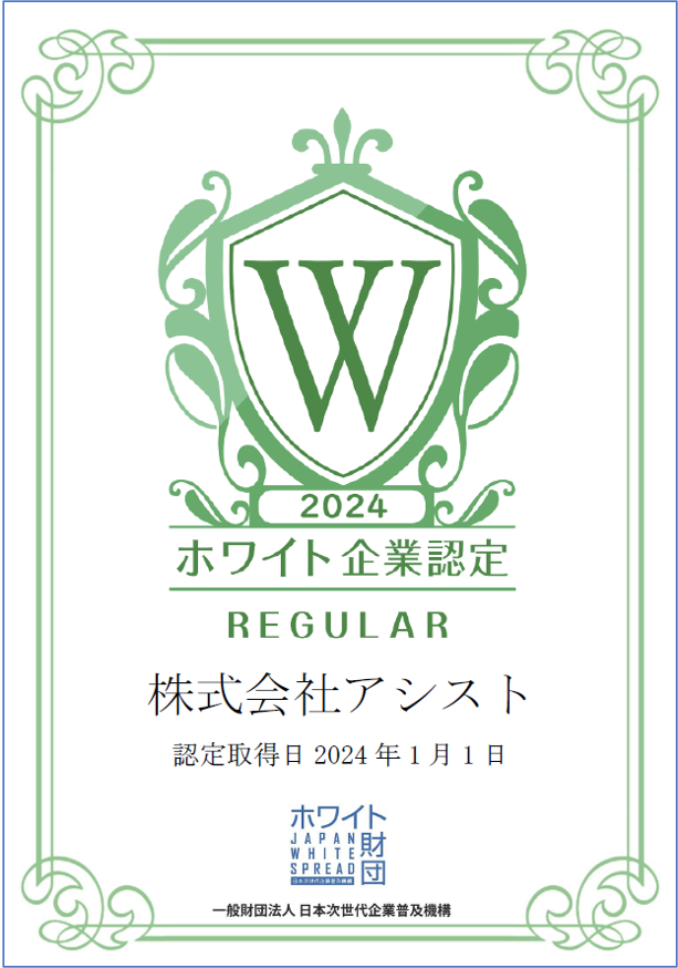 システム・アプリケーションの開発、WEB制作からサポートまでをワンストップで提供する株式会社アシスト(本社:東京都千代田区、代表取締役社長:宇井 和朗、以下 アシスト)が、2024年1月1日「ホワイト企業認定 レギュラー」に認定されたことをお知らせします。
