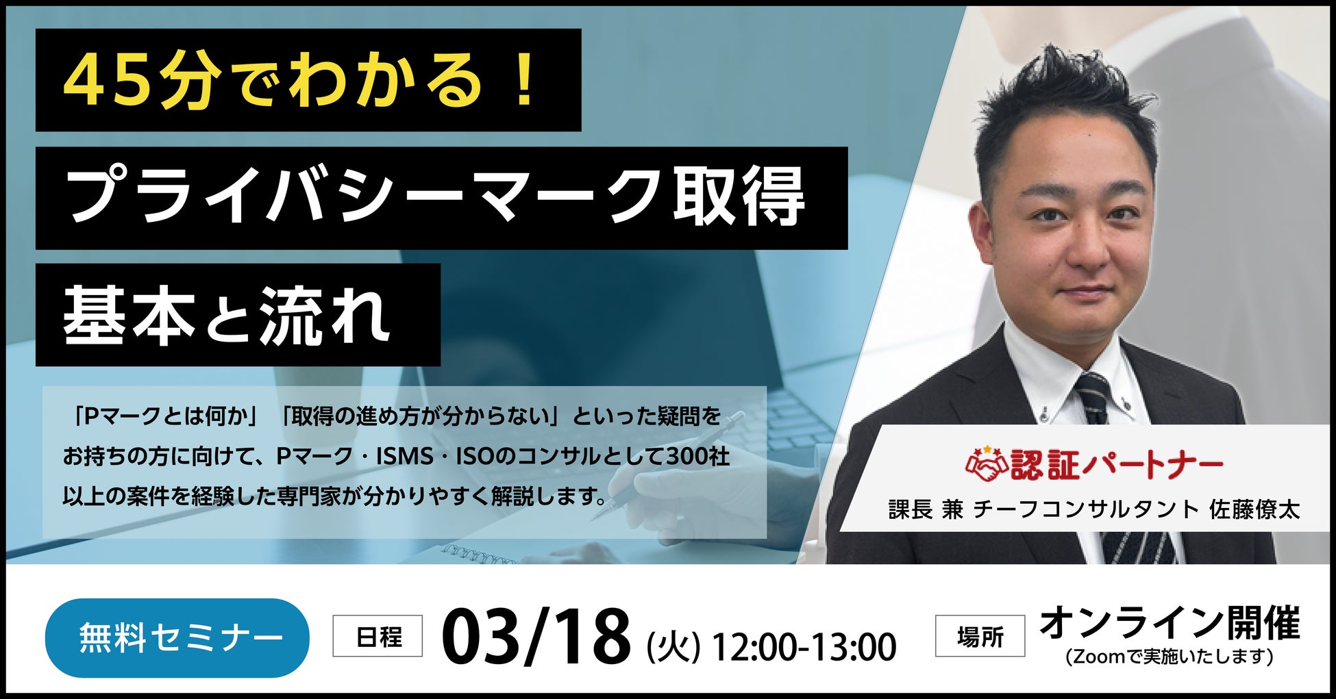 ISO・Pマーク⽀援実績数全国No.1※のISO/Pマークの取得・運⽤⽀援サービス「認証パートナー」を提供する株式会社スリーエーコンサルティング(本社:大阪府大阪市、代表取締役社長:竹嶋 寛人)は、3月18日(火)12:00-13:00「45分でわかる!プライバシーマーク取得の基本と流れ 無料オンラインセミナー」を開催します。「そもそもPマークってなに?」「Pマークの取得を考えているけど、何から始めたらいいか分からない…」という方へ向け、取得のメリットや取得の流れ、ポイントと注意事項などをPマークのプロが分かりやすく解説いたします。