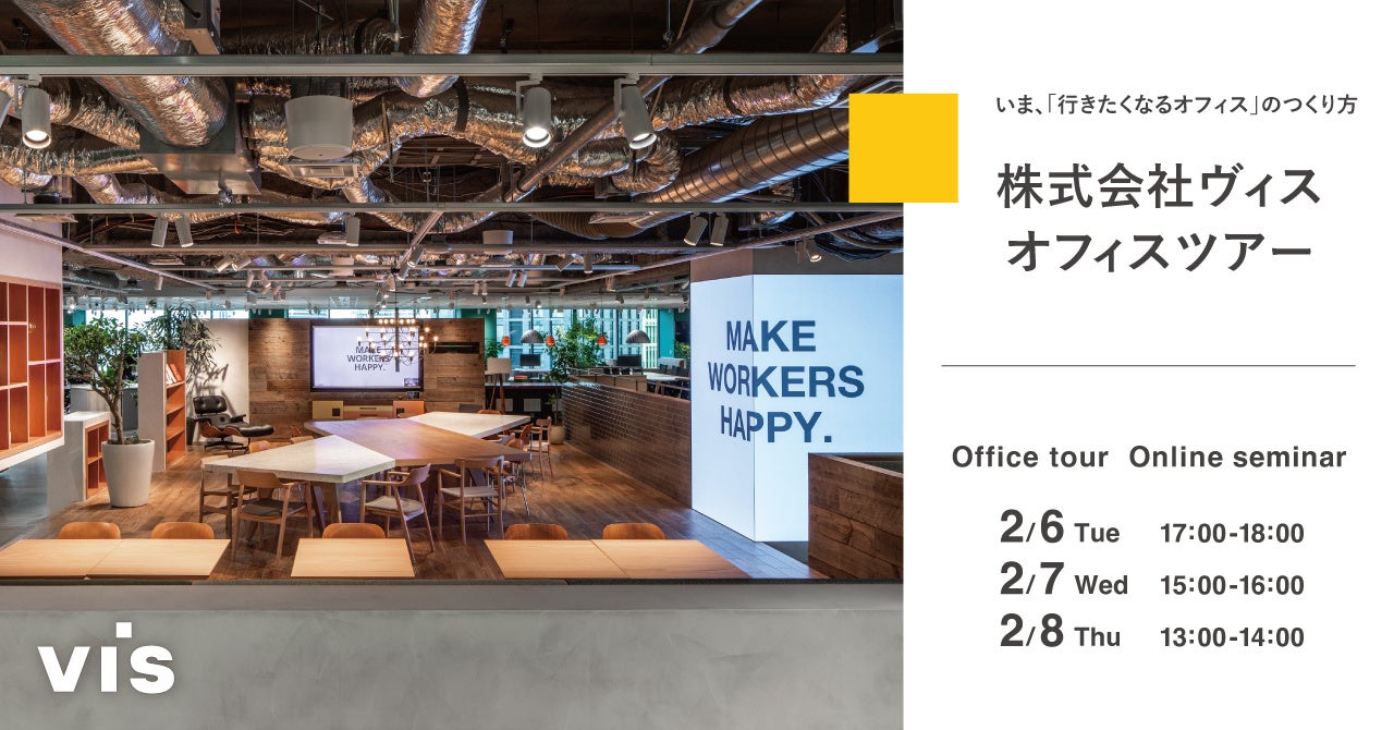 ワークデザインを手がける株式会社ヴィス(本社:大阪市北区、代表取締役社長:金谷智浩、以下ヴィス)は、2023年2月、ヴィス東京オフィスをツアー形式で紹介するオンラインセミナーを開催することをお知らせします。