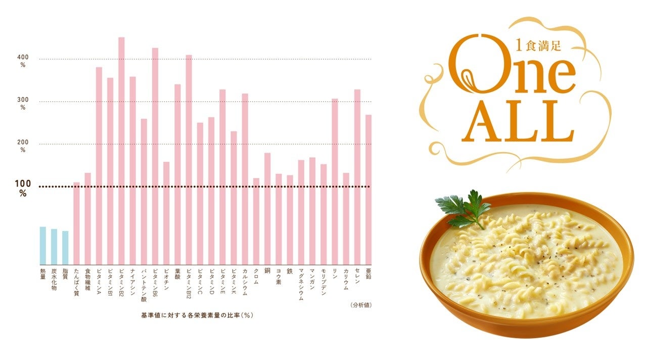 そこで今回当社は、日本初となる女性のための完全栄養食(※1)「One ALL」<濃厚クアトロフォルマッジのスープパスタ><バターチキンカレー風味のスープパスタ>を発売します。開発に当たっては、1,000人以上の女性の、完全栄養食に期待する栄養設計や食事としてのおいしさについてのリアルな声を反映させました。