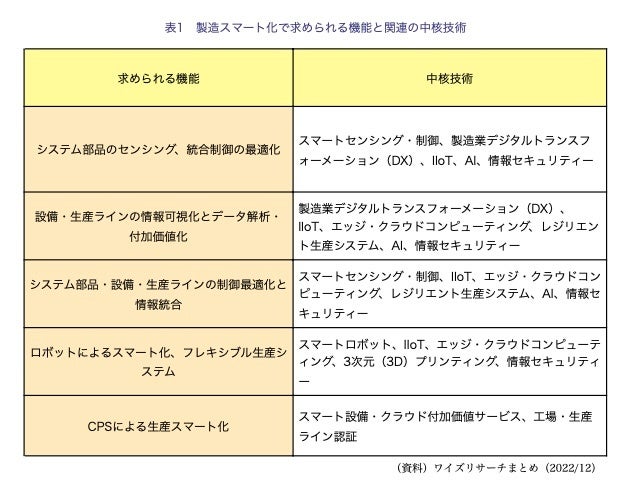 製造スマート化で求められる機能と関連の中核技術は以下の表の通りである。