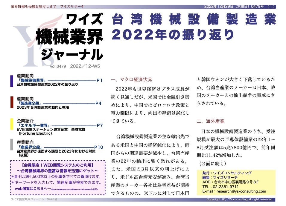 ワイズコンサルティング グループ(本社:中華民国台北市、代表取締役:吉本康志)は台湾機械業界専門誌「ワイズ機械業界ジャーナル」の2022年12月第5週号を発行しました。今週号では、機械設備業界、製造業全般の動向、EV用充電ステーション運営企業の華城電機と台湾産業界が直面する課題を紹介します。