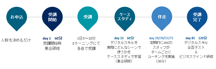 3か月で、1レッスン5~10分ほどのコンテンツであるeラーニングと、計7回の研修やチームコーチング(オンラインにて実施)を掛け合わせ、DXに必要不可欠なITスキルに加えて、Excel/Word/PowerPointなどの業務で必須となるソフトウェアや、その他にも様々なソフトウェアを実際に用いて学習していきます。