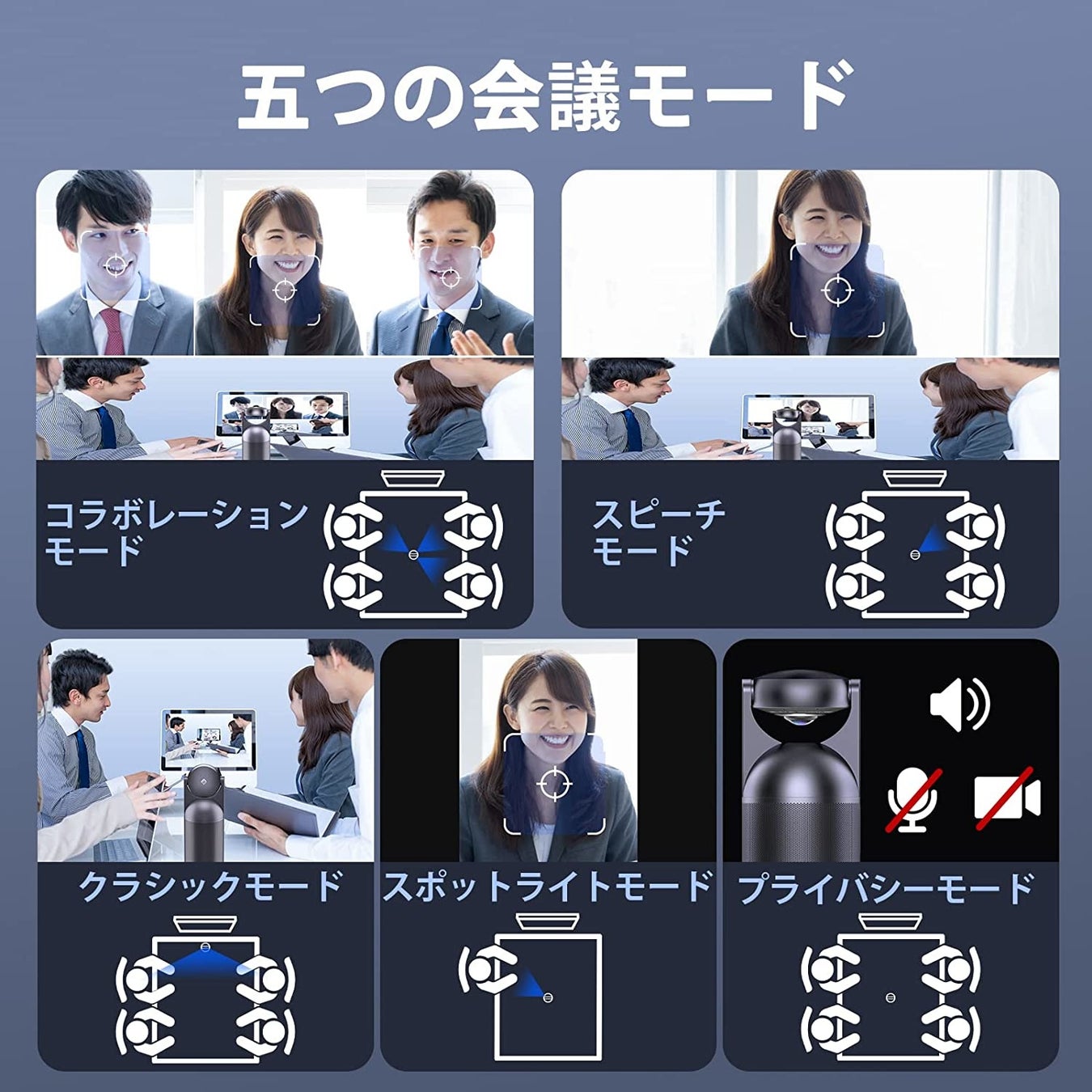 EMEET ウェブカメラは360度カメラ、8つのマイクアレイと10Wスピーカーの一台三役Webカメラです。会議参加者全員の画像と声がはっきり表示されます。AI自動フォーカス技術により、発言者を瞬時に自動フォーカスできます。EMEET webカメラは、カメラマンのように発言者に素早くカメラを向け、声と画像をスムーズ且つきれいに投影し、臨場感があるWeb会議を展開します。他社との違いは、EMEET web コラボレーションモード/スピーチモードで、AI自動フォーカス機能の感度を3段階調整可能です。※ 法人様向けデモ機貸出サービス提供できますので、どうかサポートセンターに連絡してください。