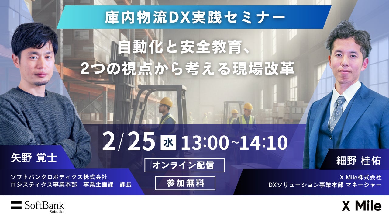 物流事業者向けSaaS・プラットフォーム「ロジポケ」を提供するX Mile株式会社(読み:クロスマイル、本社:東京都新宿区、代表取締役:野呂 寛之、以下「当社」)は、ソフトバンクロボティクス株式会社(本社:東京都港区、代表取締役社長 兼 CEO:冨澤 文秀、以下「ソフトバンクロボティクス」)と共同で、「庫内物流DX実践セミナー~自動化と安全教育、2つの視点から考える現場改革~」を実施することをお知らせいたします。