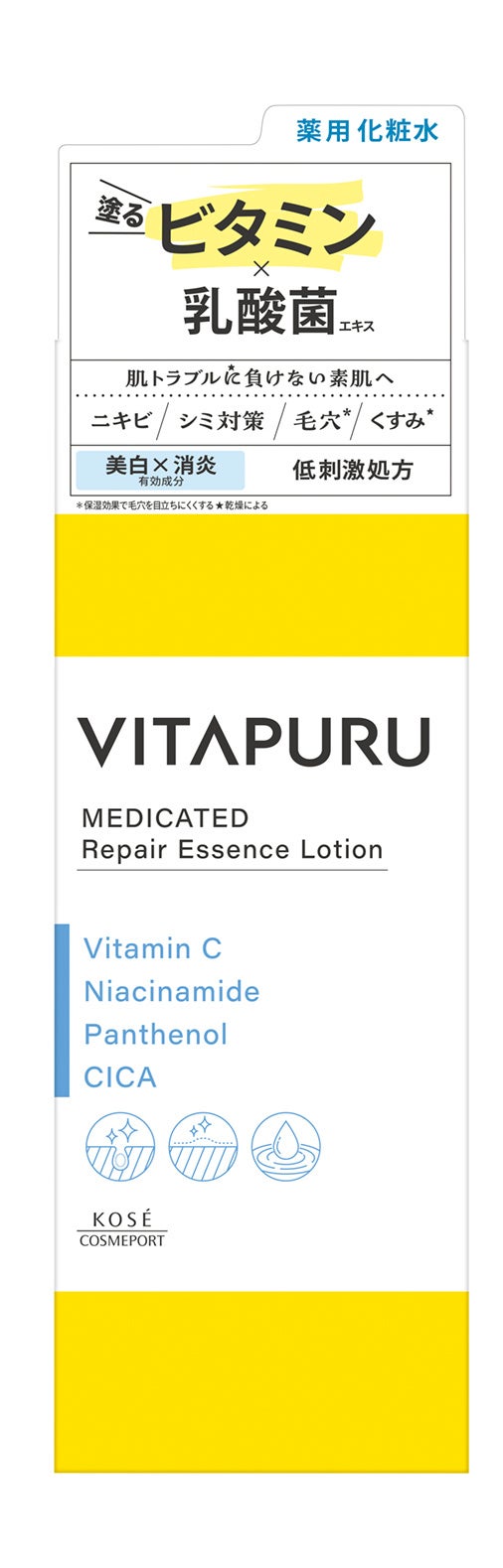 ② | ビタプル リペア エッセンスローション 【医薬部外品】 販売名称:ビタプル ローション | “塗る!ビタミン×乳酸菌ケア”で肌トラブル*に負けない素肌へ導く化粧水。美白有効成分 高純度ビタミンC誘導体、消炎有効成分 グリチルリチン酸ジカリウム配合。乳酸菌(美肌菌培養)エキス※8・BG(保湿)配合。バリア機能に大切なうるおいをすみずみまで届け、ふっくらキメのある肌にととのえます。 | 200mL |