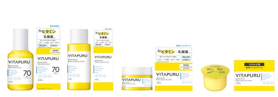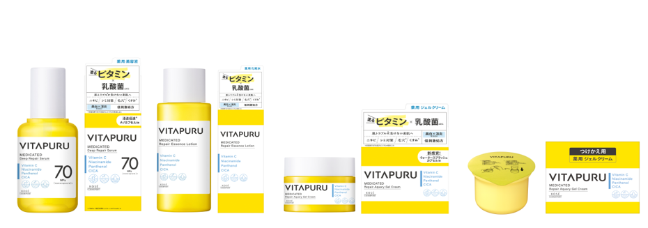 『ビタプル』はセラム・ローション・ジェルクリームの3アイテムをラインナップしています。「ディープリペア セラム」は洗顔の後スキンケアの一番最初に使用する美容液です。ナノサイズの微細化カプセルを配合。肌を瞬時にほぐし角層深部まで素早く浸透。その後のスキンケアの肌なじみを向上させ、お手入れ効果を高めます。「ビタミンCPX※2」を高濃度※7配合していることも特長です。「リペア エッセンスローション」はみずみずしく角層深くまで浸透するオイルフリー処方の化粧水です。バリア機能に大切なうるおいをすみずみまで届け、ふっくらキメのある肌にととのえます。「リペア アクアリージェルクリーム」は、肌になじませるとみずみずしい使用感に変化する新感覚のジェルクリームです。肌の上でピタっと膜をはり、うるおいをしっかり閉じ込めます。