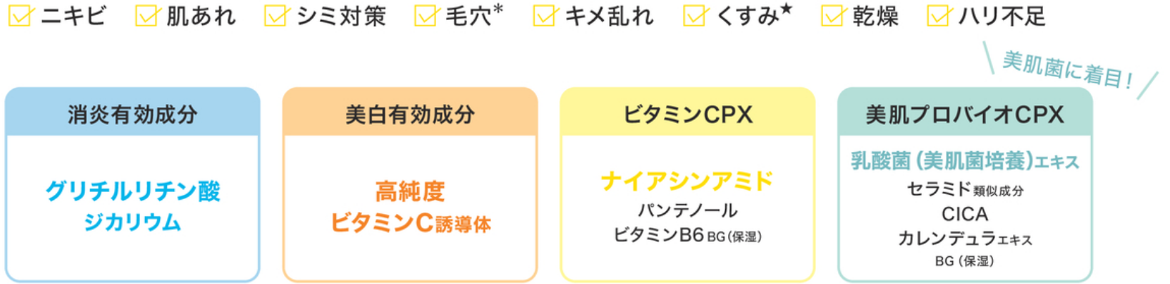 ① | ビタプル ディープリペア セラム 【医薬部外品】 販売名称:ビタプル セラム | “塗る!ビタミン×乳酸菌ケア”で肌トラブル*に負けない素肌へ導く美容液。美白有効成分 高純度ビタミンC誘導体、消炎有効成分 グリチルリチン酸ジカリウム、ビタミンCPX※2高濃度※7配合。乳酸菌(美肌菌培養)エキス※8・BG(保湿)配合。角層深くまで浸透し、その後のスキンケアのなじみを高めます。 | 40mL |