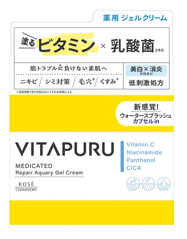 ③ | ビタプル リペア アクアリージェルクリーム 【医薬部外品】 販売名称:ビタプル ジェルクリーム | “塗る!ビタミン×乳酸菌ケア”で肌トラブル*に負けない素肌へ導く美容液。美白有効成分 高純度ビタミンC誘導体、消炎有効成分 グリチルリチン酸ジカリウム配合。乳酸菌(美肌菌培養)エキス※8・BG(保湿)配合。肌の上でパシャっとはじける新感覚。その後、膜を張り、うるおいをしっかりと閉じ込めます。 | 90g |