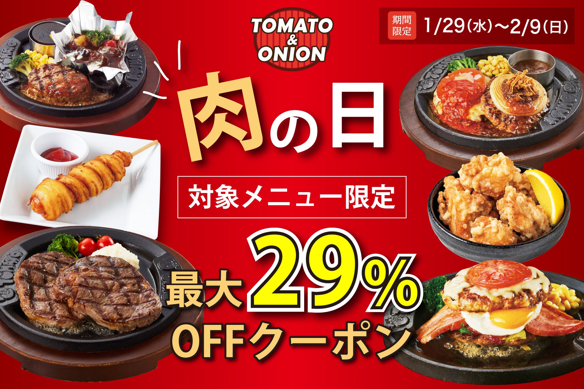 株式会社トマトアンドアソシエイツ(本社:兵庫県西宮市、代表取締役社長:小林 大二)が運営する、アメリカンダイニングレストラン「トマト&オニオン」では、2025年1月29日(水)の【肉の日】にちなんで、最大29%OFFになる「肉の日クーポン」をトマト&オニオン公式アプリで配信いたします。