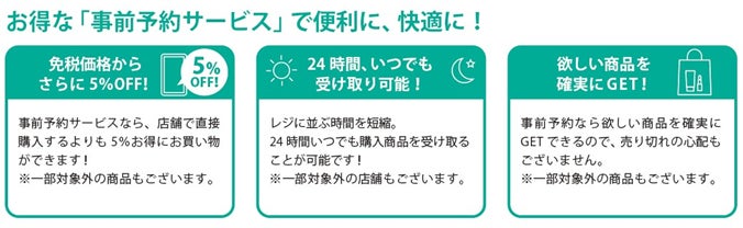 本サービスは、羽田空港から出国される旅客が、出国の24時間前までであればいつでも免税品を予約することができ、予約品は羽田空港出国手続き後の出発ロビー内免税店で受け取ることができるサービスです。出発前に免税品を予約できるため、店頭で在庫切れの心配がないだけでなく、免税店を巡って商品を探したり、レジに並ぶ必要もなく、空港での時間をより有効的に活用いただけます。さらに、免税価格から5%OFFで購入いただけるため、店舗で直接購入するよりも、お得に買い物をお楽しみいただけます。