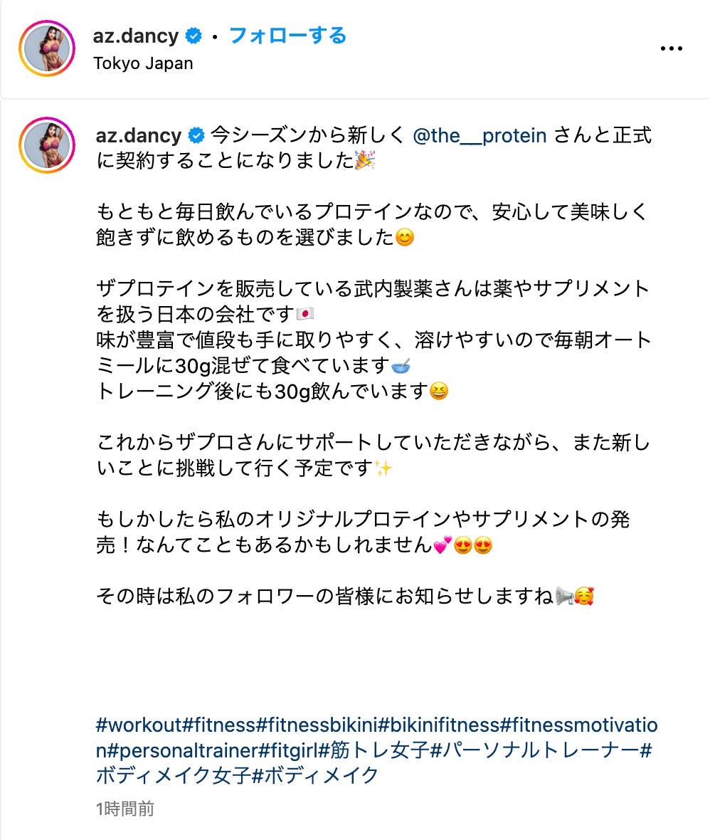 プロテインブランド THE PROTEIN(通称:ザプロ)がビキニフィットネスアスリート "ダンシーあずさ選手"と公式スポンサー契約を締結!!