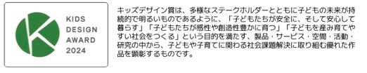 当社では今回の受賞を通じて、より一層「キッズデザイン」の認知拡大を目指すとともに、子どもの安全・安心を考え、環境に配慮した商品・サービスの開発を進めていきます。