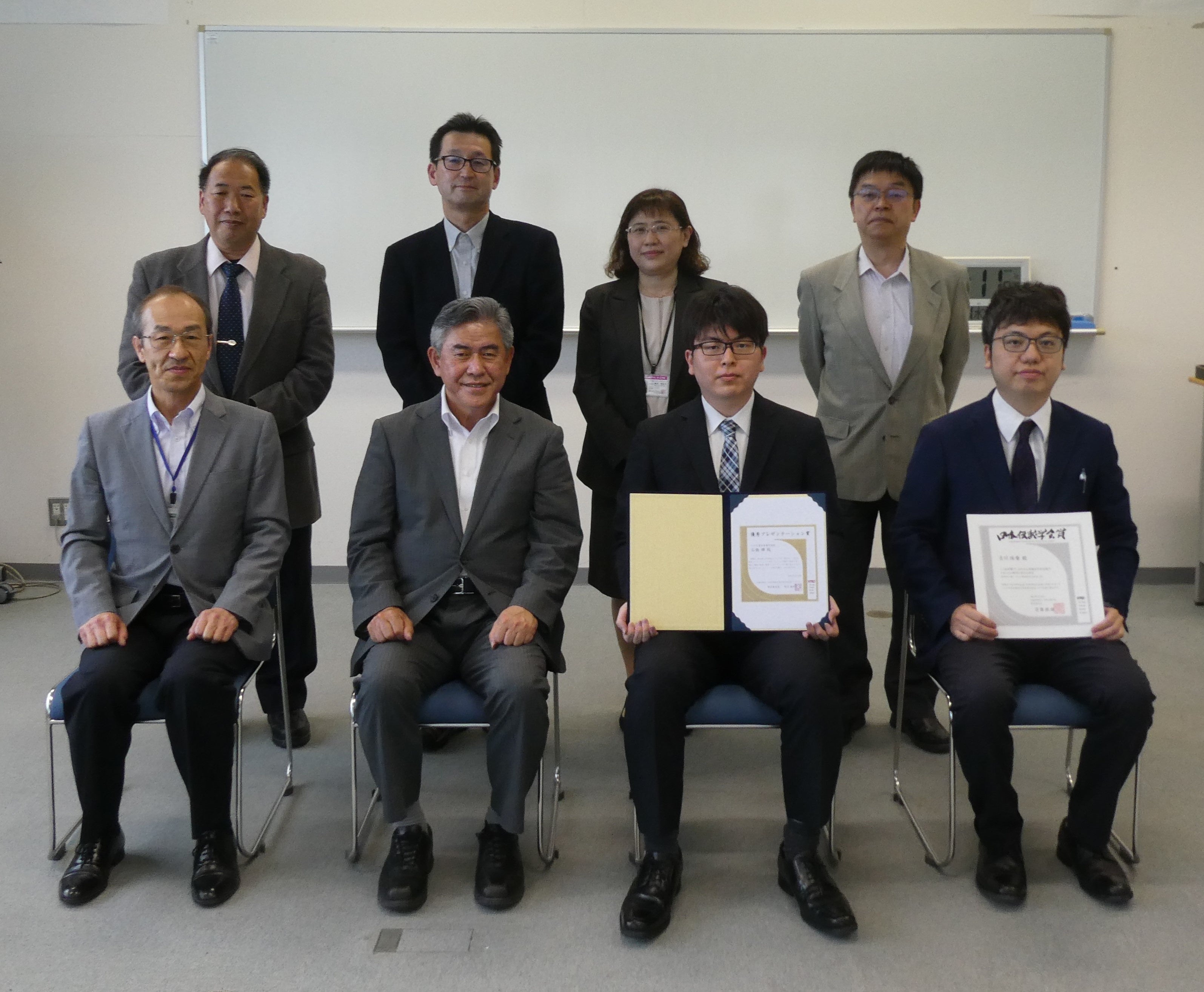 図 5 表彰状を手にする石橋さん(前列右から2人目)、指導教員の古川助教(前列右端)と圓山校長(同左から2人目)