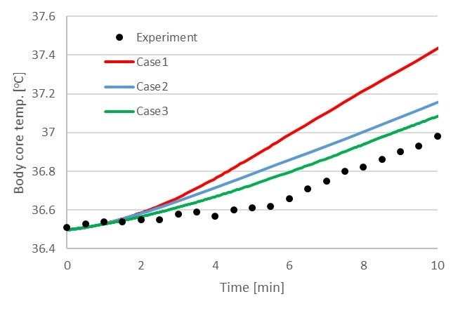 さらに,共同研究者の西館来夢さんとシミュレーションで導出されたふく射伝熱量を使用して,人体内部の深部温度の時間変化予測を行いました.(図4参照)予測には生体温熱モデルのモデルパラメータを調節することによって,実験結果をある程度再現可能であることが明らかとなりました.しかしながら,定量的には一致しておらず,モデルの改良が必要であることが示されました.